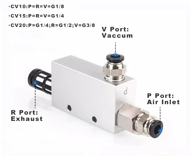 CV -vakuumski generatorji Ouleikai (OLK) se uporabljajo za zagotavljanje vakuumskega okolja, potrebnega za sesalne šobe ali napeljave. Sesalna vrata mora biti povezana s stisnjenim zrakom, medtem ko je sesalna skodelica priključena na vakuumska vrata. Ko stisnjeni zrak teče iz dovodnega vhoda do izpušnega vrat, se na vakuumskem pristanišču ustvari vakuum. To vakuumsko silo lahko uporabite za spoštovanje predmetov, doseganje nalog, kot je pritrditev ali podporo, s čimer izboljšajo operativno učinkovitost v industrijski proizvodnji.