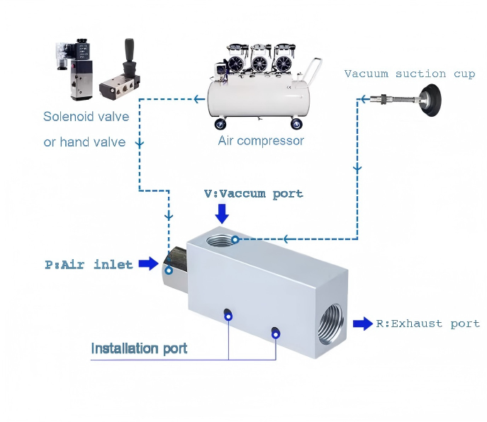 vakuumske črpalke in vakuumski generatorji. Vakuumska črpalka je mehanska naprava, ki ustvarja podtlak na sesalni odprtini in omogoča, da izpušna odprtina neposredno prehaja skozi atmosfero, z visokim tlačnim razmerjem na obeh koncih za izločanje plina. Generator vakuuma je pnevmatska komponenta, ki izkorišča pretok stisnjenega zraka za ustvarjanje določene stopnje vakuuma. V primerjavi z vakuumsko črpalko ima preprosto strukturo, majhno prostornino, majhno težo, nizko ceno, priročno namestitev, enostavno sestavljanje s podpornimi komponentami, hitro ustvarjanje in sproščanje vakuuma in je primerna za intermitentno delo z nizkim pretokom, primerna za razpršeno uporabo.