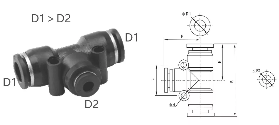 PE prileganje (enakovredna zveza Tee): Vse tri cevi imajo enak zunanji premer, primerni za povezovanje treh pnevmatskih cevi enake velikosti.