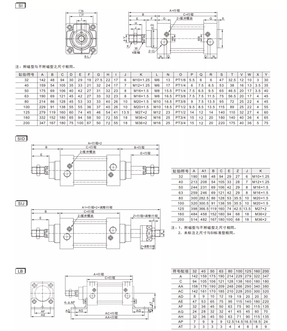 Standardni pnevmatski cilinder serije SI ISO15552 je na voljo v treh vrstah: standardni dvojno delujoči, dvopalični dvojno delujoči SID in dvojni palični dvojno delujoči SIJ z nastavljivim hodom. Ustrezajo standardu ISO 15552, kar pomeni, da so njihove vgradne mere večje odSU pnevmatski cilindrienake velikosti. Fiksni dodatki niso zamenljivi in so združljivi samo s specifikacijami ISO 15552 (prej ISO 6431).